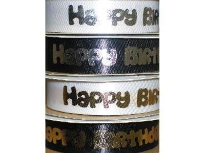 Funky "Happy Birthday" foiled satin (20mm X 20m) ASSORTED COLOURS